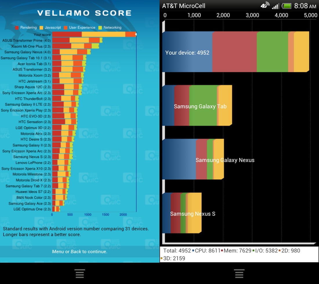 Confrontando i risultati ottenuti con il One XL e quelli dell‘One X, si può constatare che il dual-core della Qualcomm non ha niente meno del quad-core della NVidia, confermando ancora la teoria della Sony sui primi SoC quad-core, dovevano ancora maturare e sono poco ottimizzati per rendere il loro massimo.